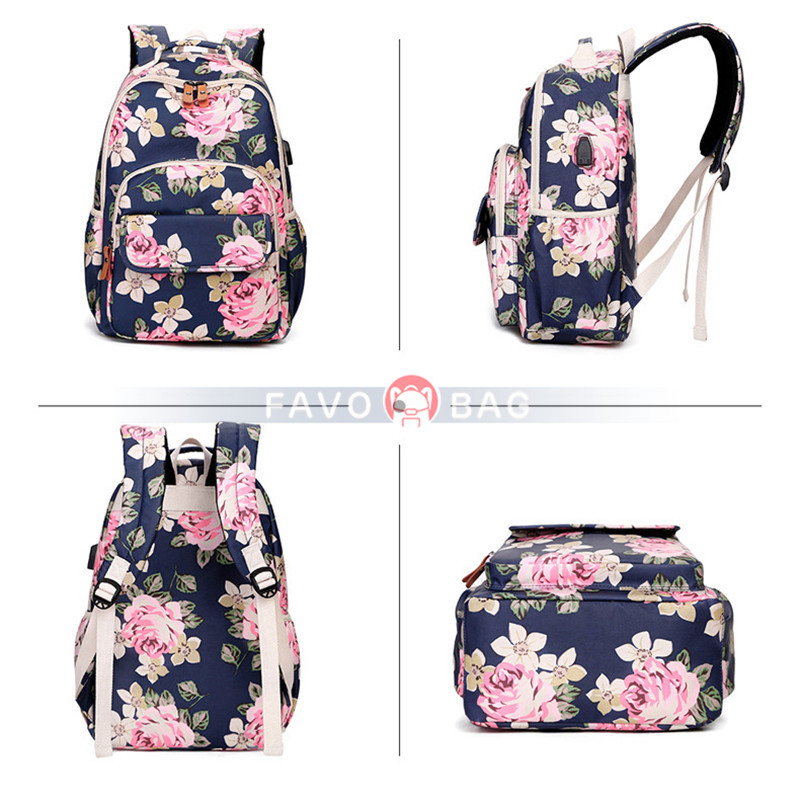 Vintage backpack with floral design; but the floral design may have slight difference with each bag. Main compartment with double-zipper closure; 2 exterior pockets; Water-bottle pockets on both sides; 1 padded pocket; 1 interior mesh zipper pocket.